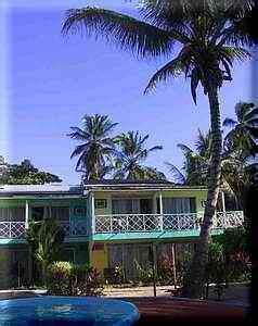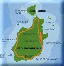 Wir chartern ein Taxi und auf geht's in Richtung Hotel. Der Taxifahrer erklärt uns, dass wir hier falsch seien, wenn wir "high life" suchten, auf Providencia werde man vergeblich nach großen Diskotheken suchen. Hier auf Providencia habe man nur zweierlei: Natur und Ruhe - genau nach unserem Geschmack. Etwas hat er vergessen zu erwähnen oder es ist für ihn die normalste Sache der Welt: die überwältigende Freundlichkeit der Einheimischen. Auf dem letzten Kilometer geht's dann über Stock und Stein. Die Straße geht in einen Schotterweg über - wir sind wohl am Ende der Welt. Wir werden herzlich begrüßt. "El Profe", seines Zeichens Verwaltungschef und Koch - in früheren Zeiten in Calí/Kolumbien Philosophie-Professor - macht uns sofort Frühstück: Rührei !!! In den nächsten Tagen erweist er sich als wirklich exzellenter Koch. Fische und Lobster für seine ausgezeichnete Küche werden am Abend von Kike in den Riffen gefangen. Das Hotel besteht aus drei an den Berghang gebauten Häusern mit drei oder vier Apartments. Unser Apartment befindet sich im obersten Haus, was zwar mit ein wenig Kraxelei verbunden ist, aber wir haben einen atemberaubenden Ausblick auf Cayo Cangrejo, die Krabben-Insel, die etwa 800 m entfernt inmitten von Korallen-Riffen liegt.